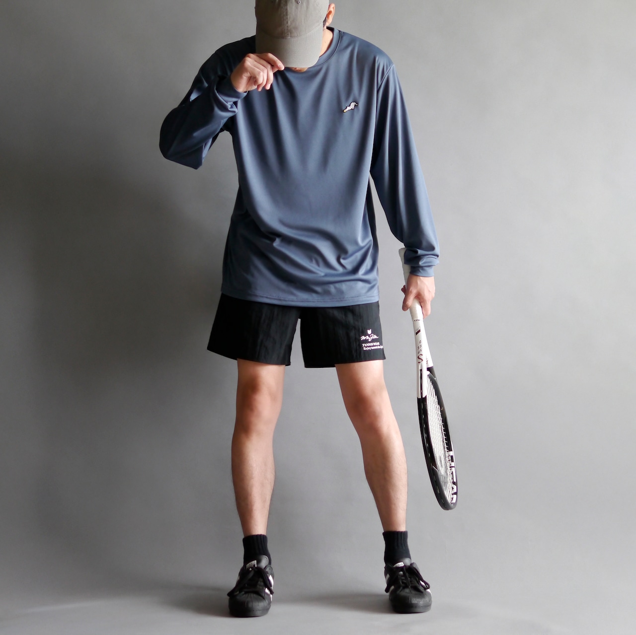 左胸のワンポイント刺繍は、テニスボールを掴んで伸びをする猫が愛らしくもスタイリッシュ。セットアップで全6色のハーフパンツもあるので、合計54種類の組み合わせの中から自分に合ったコーデを見つけよう!