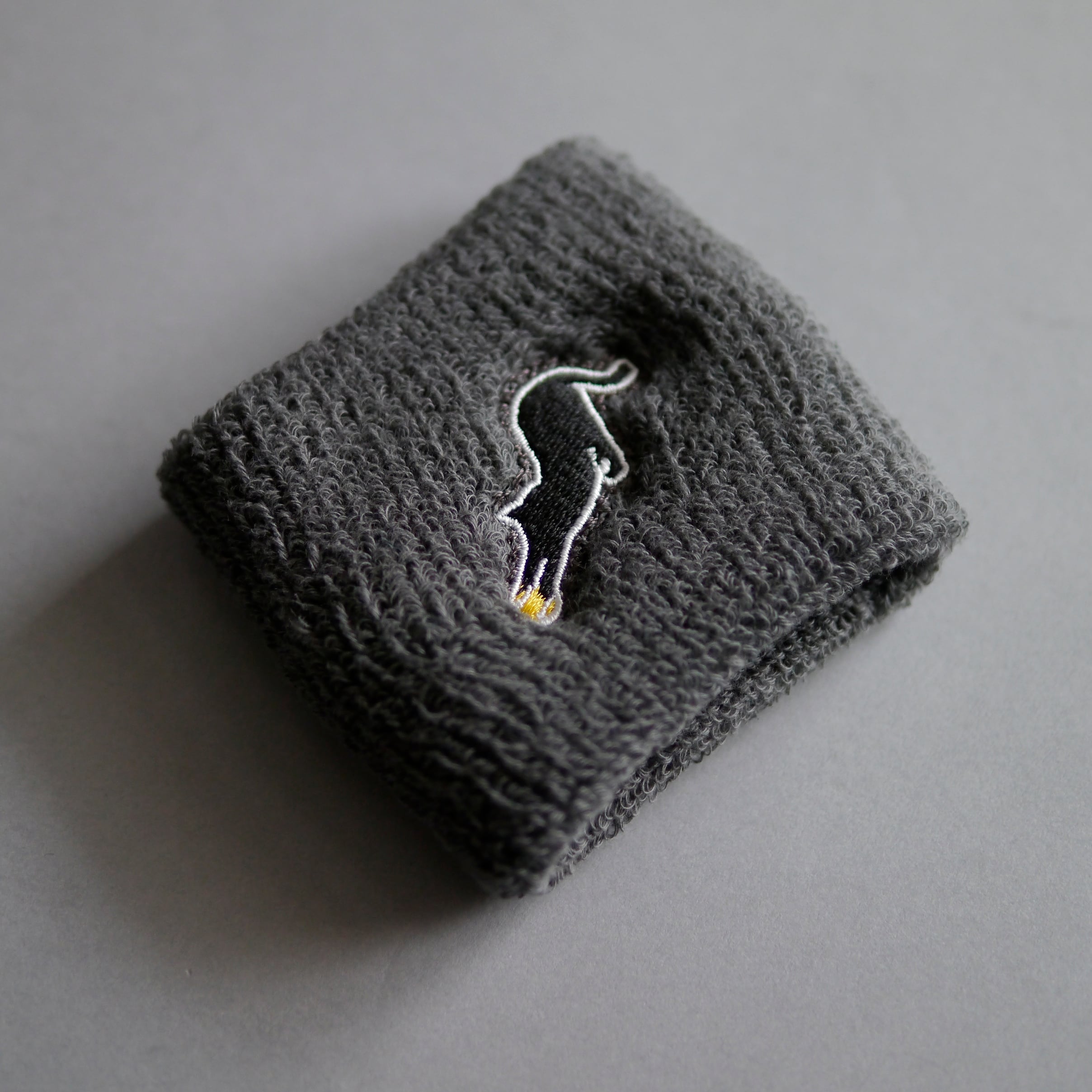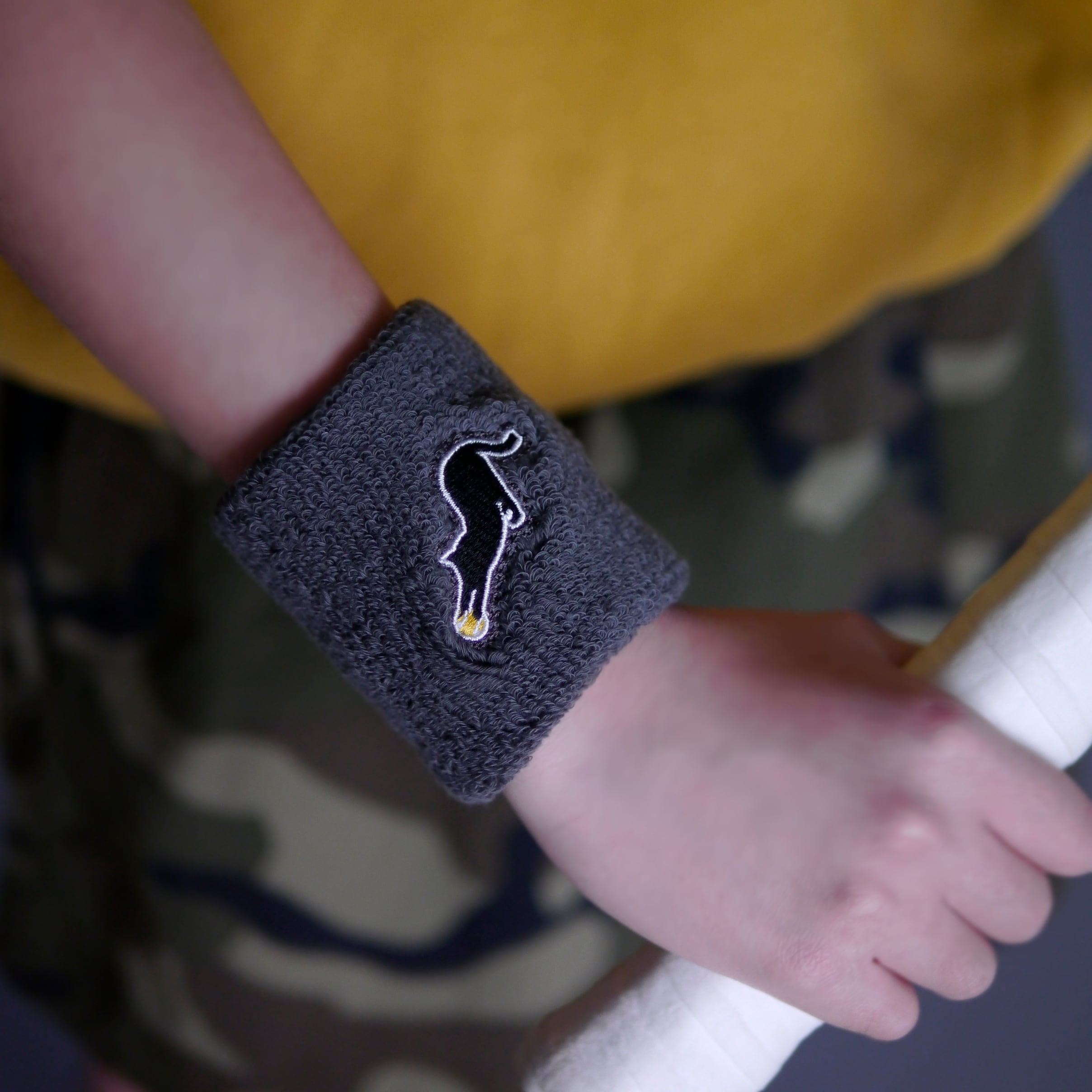 コートの上で黒猫がボールを追う...そんな遊び心をデザインしたMM20aオリジナルリストバンド。