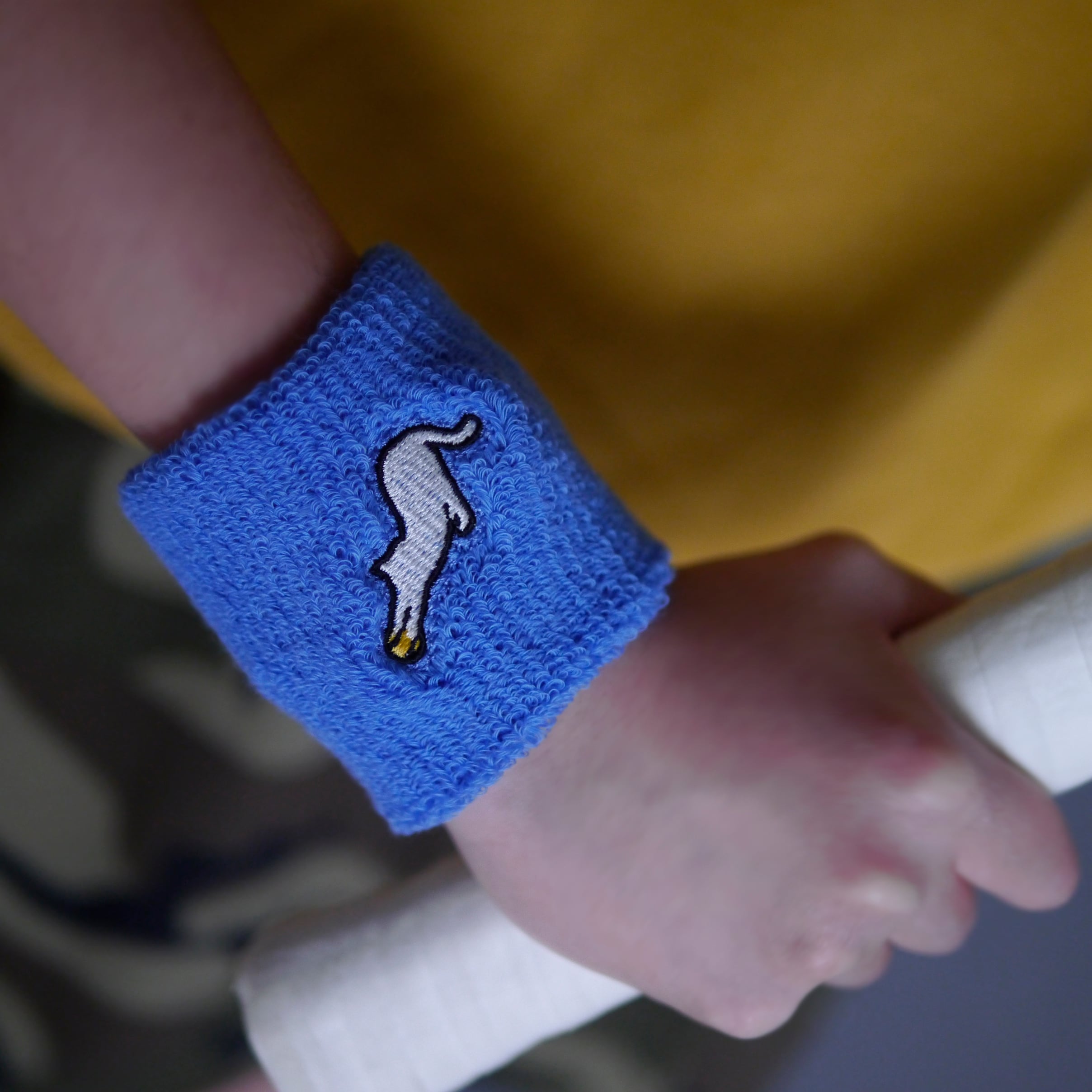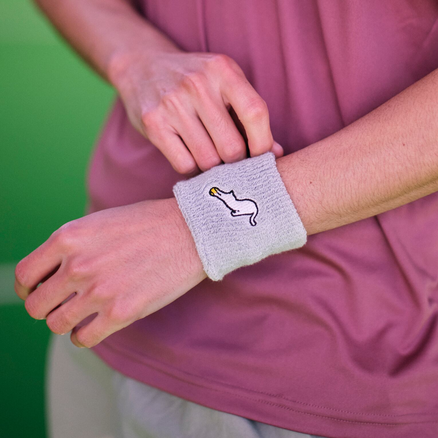 コートの上で白猫がボールを追う...そんな遊び心をデザインしたMM20aオリジナルリストバンド。