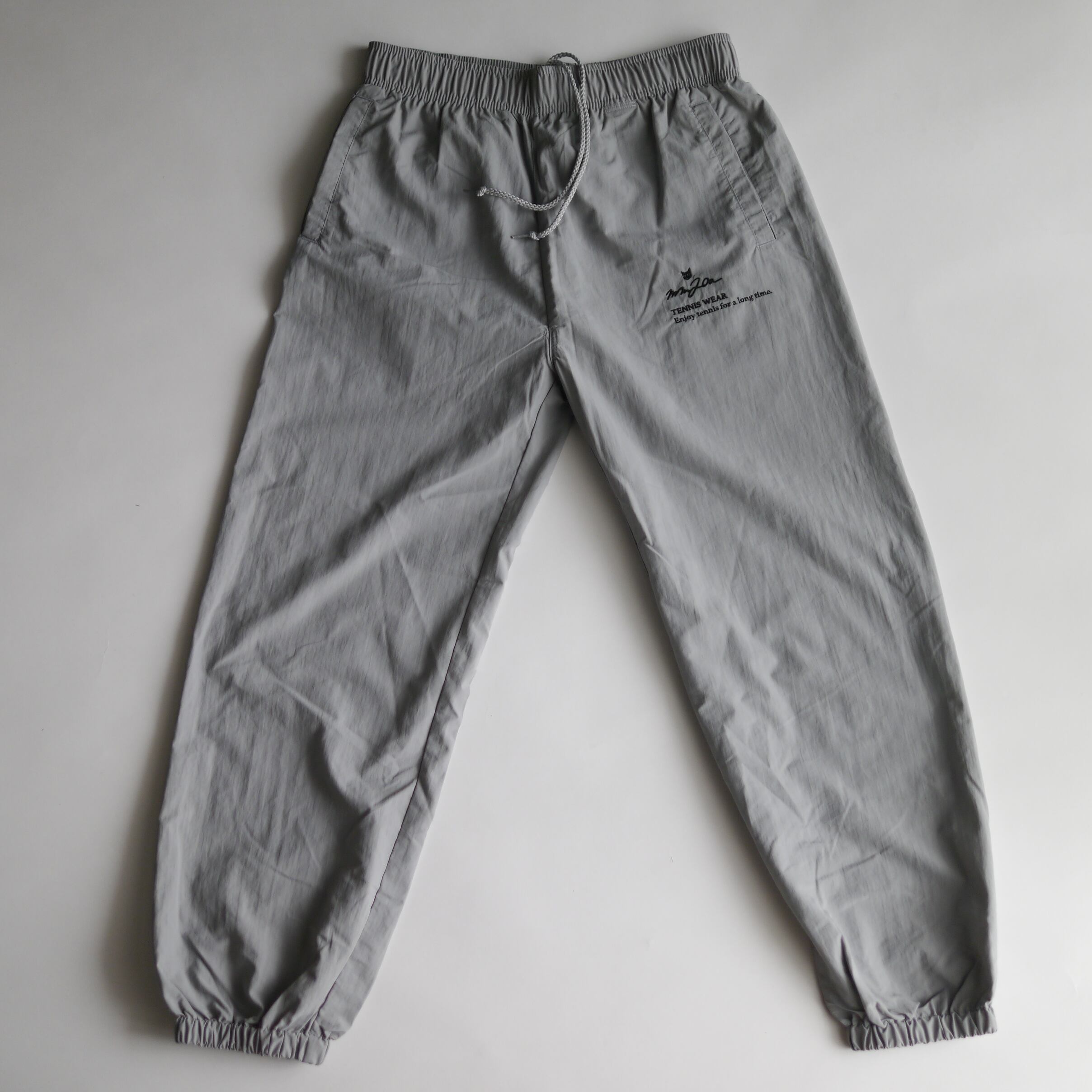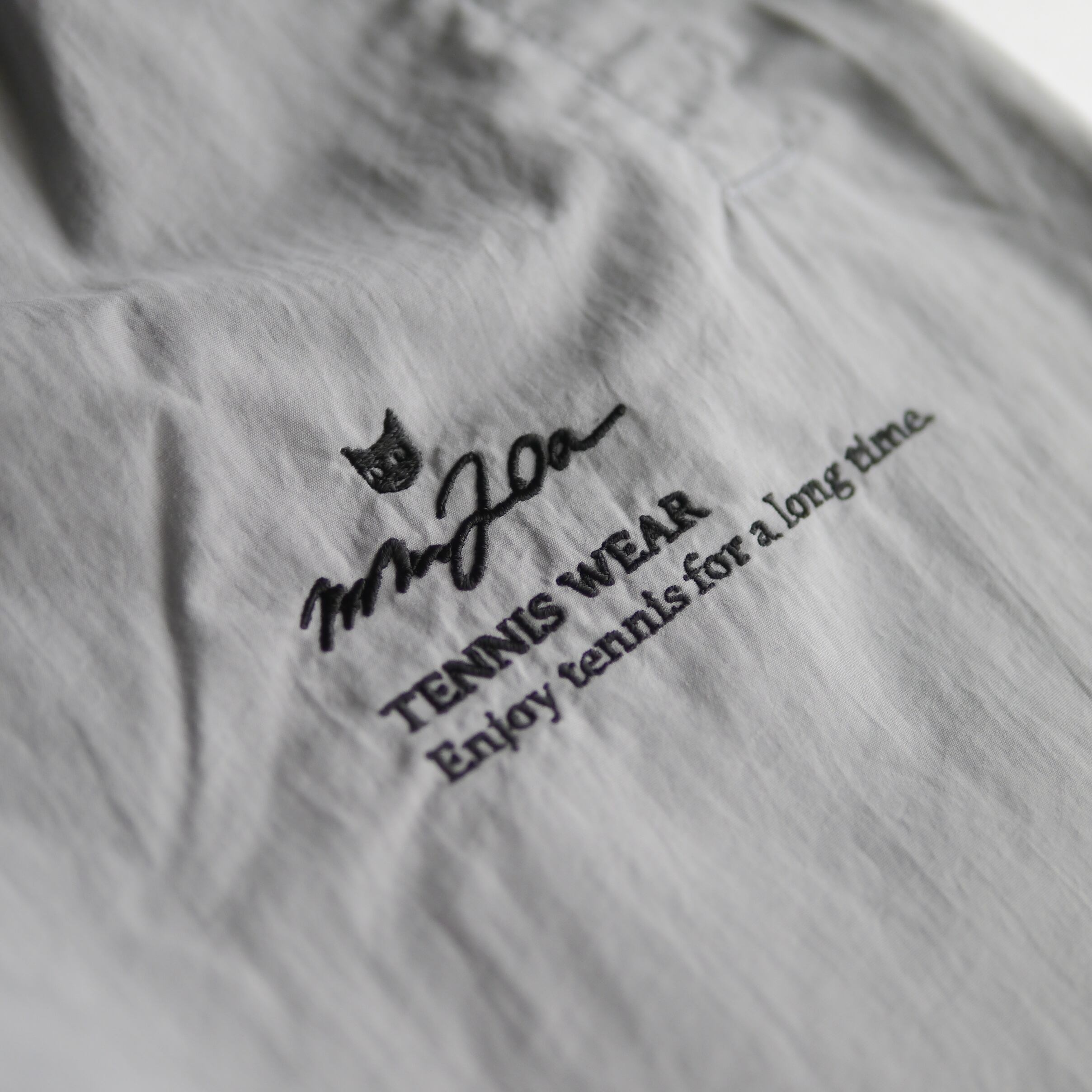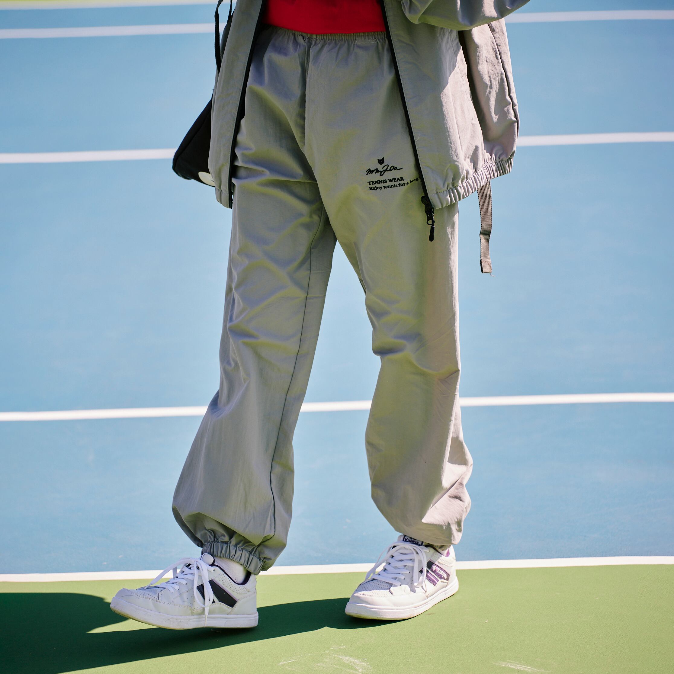 左ふともも箇所には刺繍で、MM20a TENNIS WEARのロゴとブランドコンセプトである“Enjoy tennis for a long time(テニスライフを永く楽しむ)”のメッセージが。同素材のジャケットもあるため、セットアップで着てもサマになる。