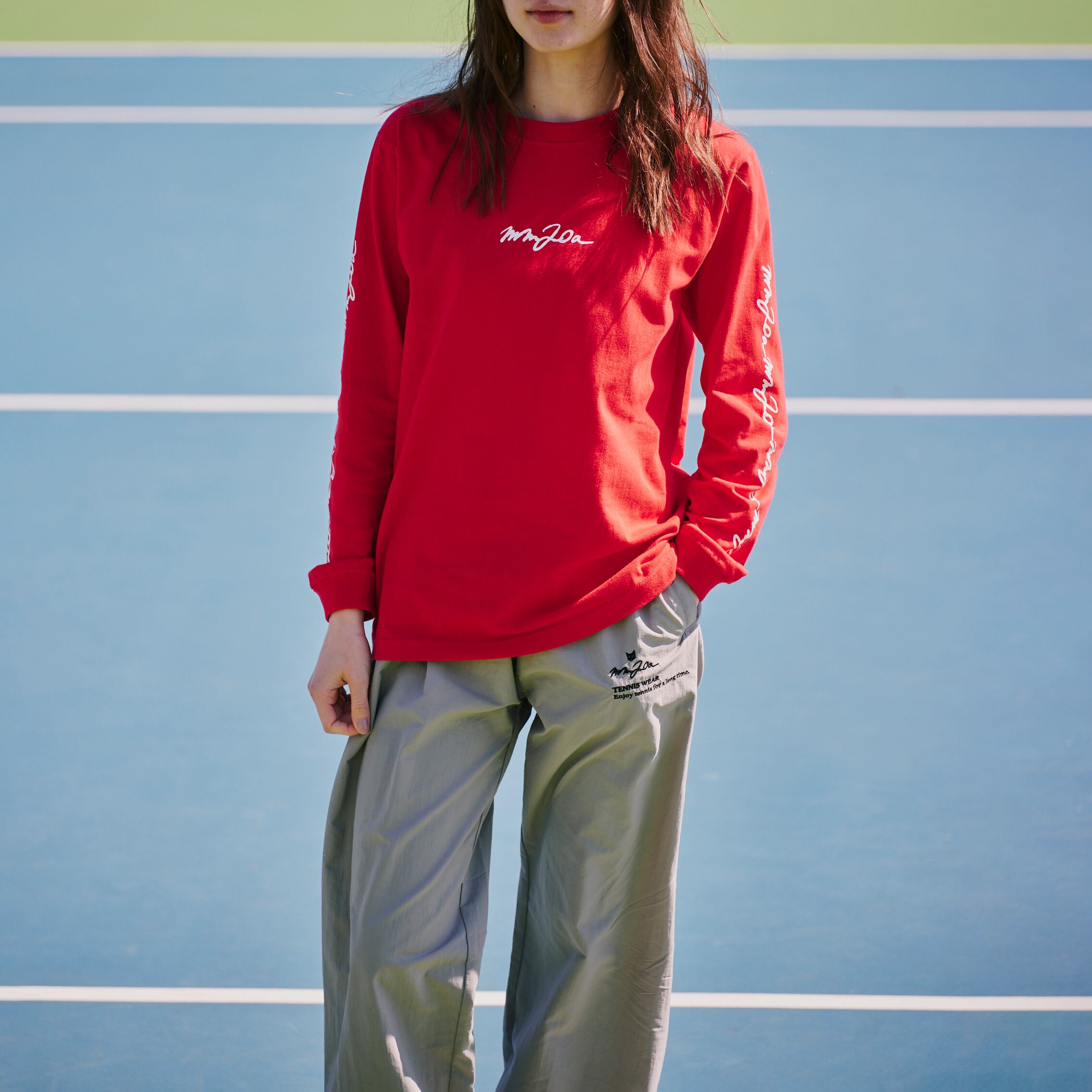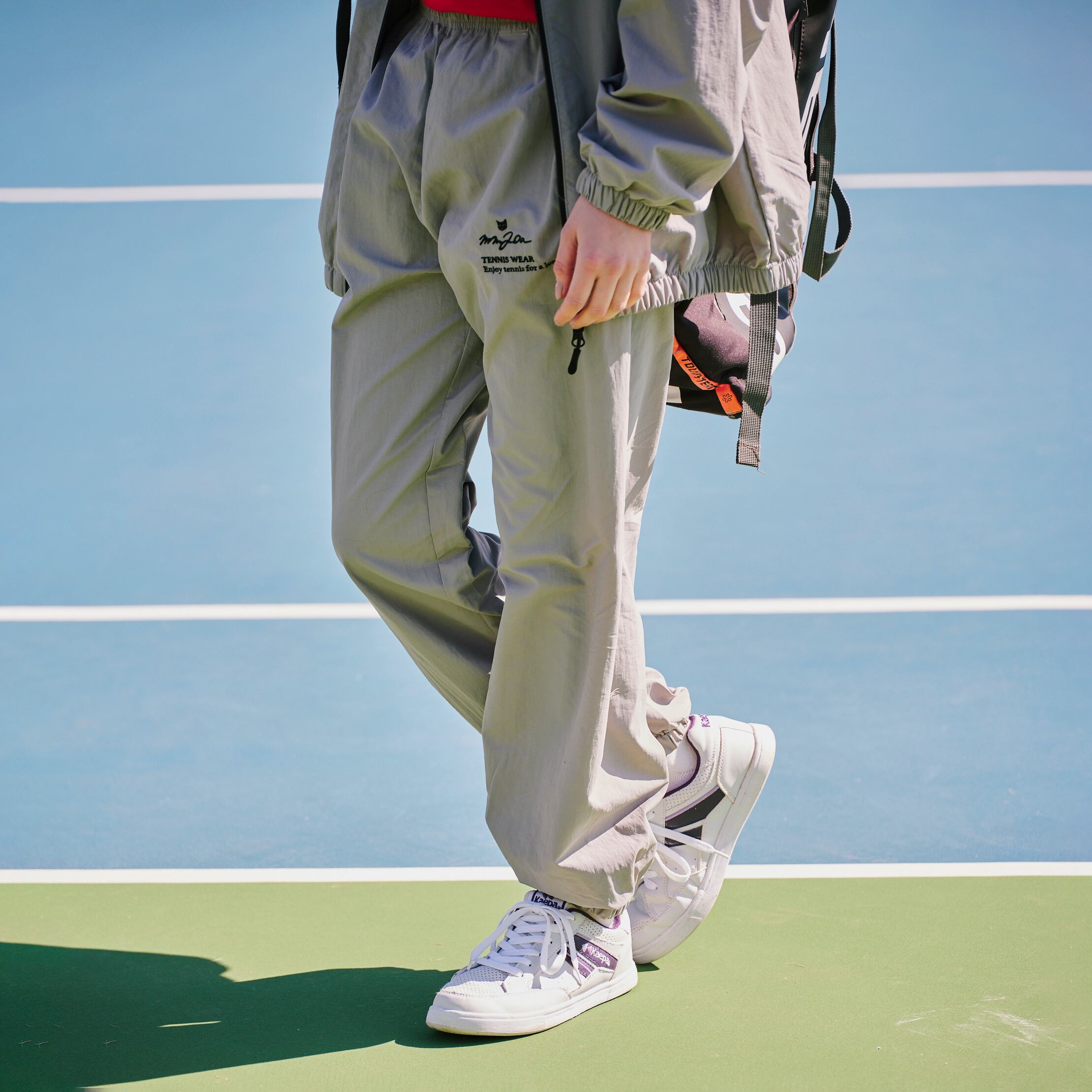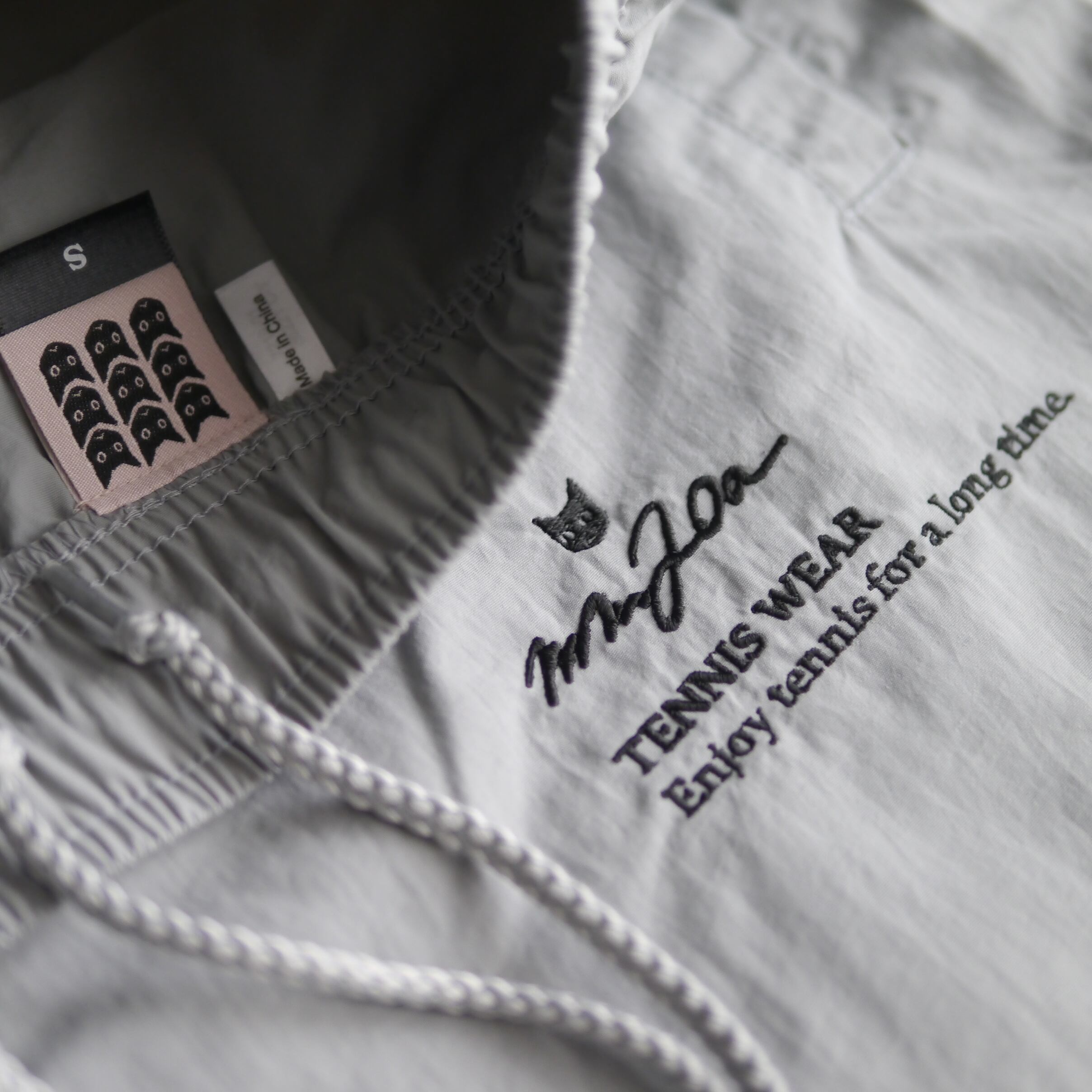 左ふともも箇所には刺繍で、MM20a TENNIS WEARのロゴとブランドコンセプトである“Enjoy tennis for a long time(テニスライフを永く楽しむ)”のメッセージが。同素材のジャケットもあるため、セットアップで着てもサマになる。