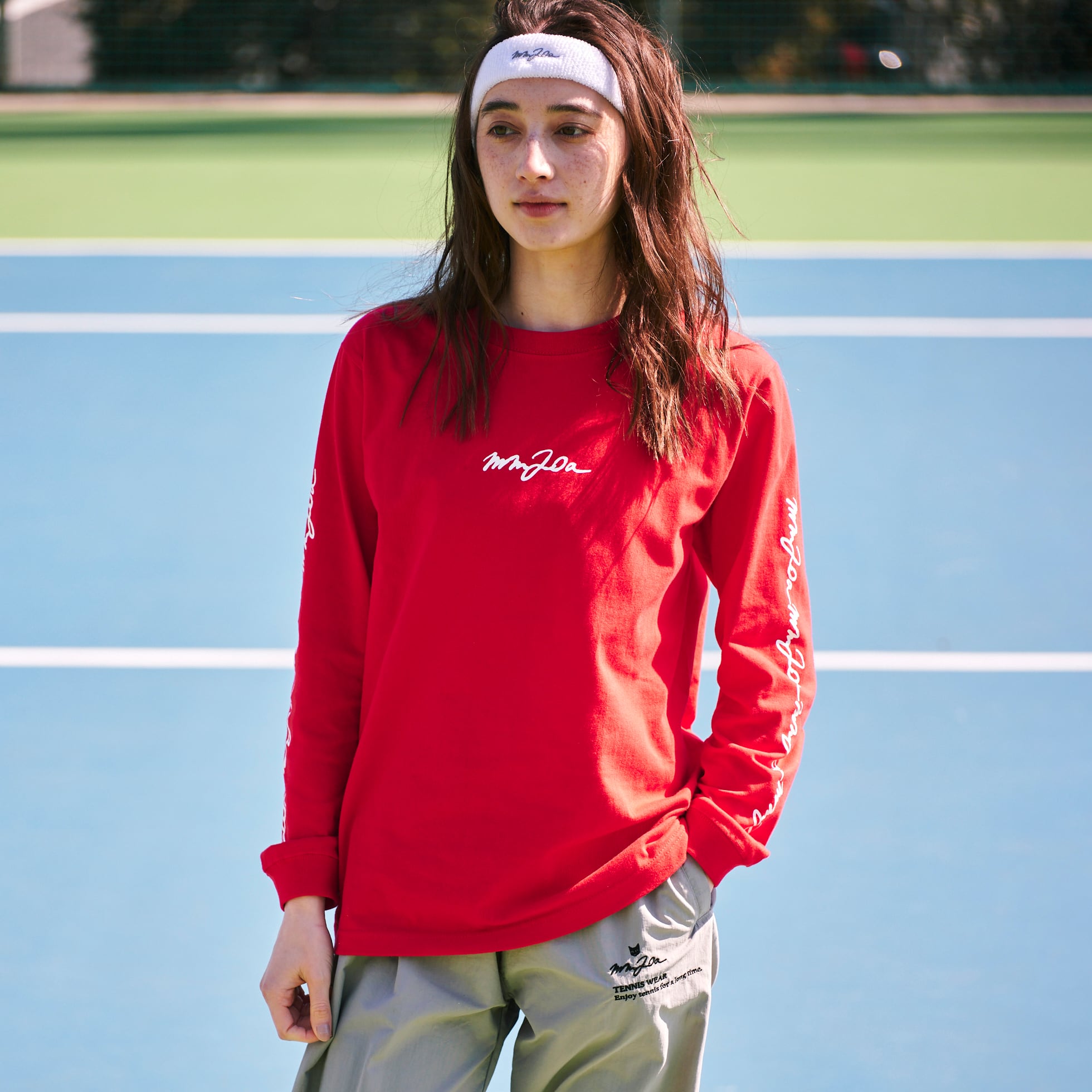 綿100%の、袖口リブ仕様のロングスリーブTシャツ。シンプルなデザインながらも、ストリートテイストの袖の連続ロゴプリントが映える。オーバーサイズでアウターにするのも良し、レイヤード(重ね着)でインナーにするのも良しの万能アイテム。